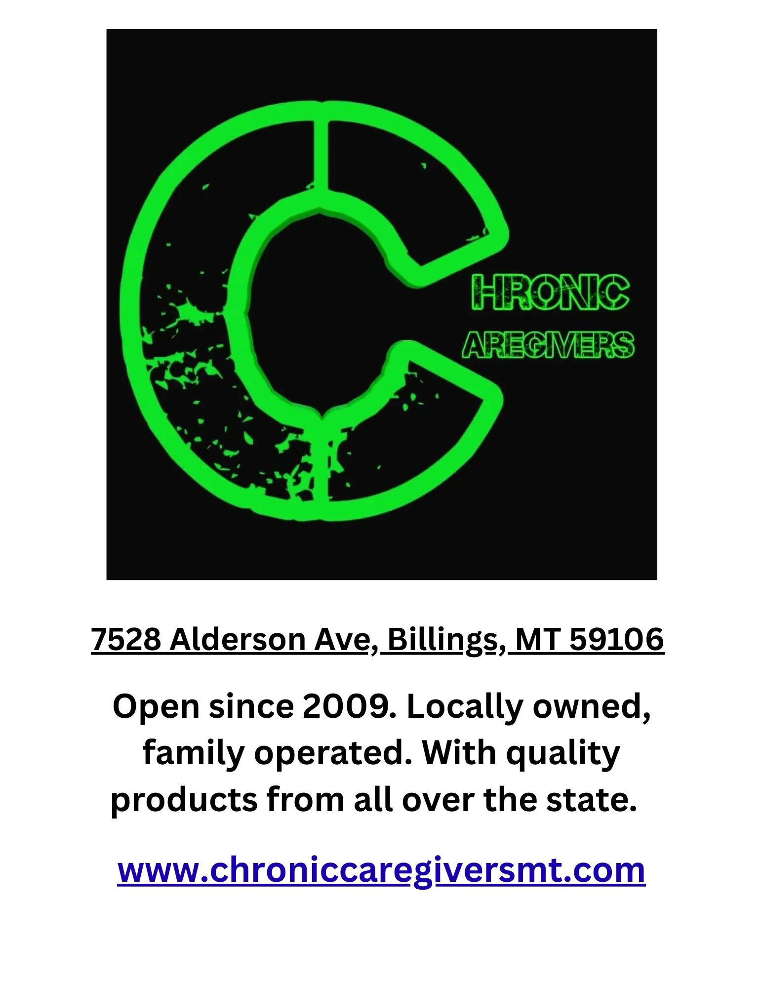 A trusted name in Montana cannabis for over a decade, Chronic Caregivers is proudly locally owned and family operated. Known for their commitment to quality, they carefully source exceptional products from cultivators across the state to ensure customers always have access to some of Montana’s finest offerings. Their longevity speaks to their reliability — and their passion for serving the community shines through in everything they do.