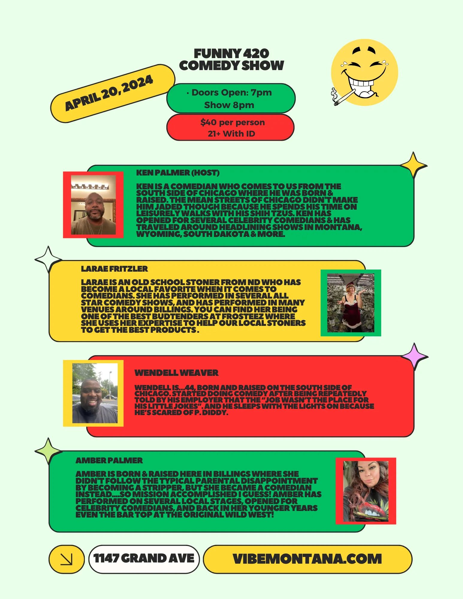 Funny 420 is Billings, Montana's first 420-themed comedy event for those 21 and older! We are bringing comedians from Billings and around the country to provide the laughs. There will be an onsite consumption tent and merchandise sales from some of your favorite shops. Snacks, non-alcoholic drinks, desserts, and more will also be available. This first-of-its-kind event in Billings will take place on April 20th. Doors open at 7 PM, and the show starts at 8 PM.